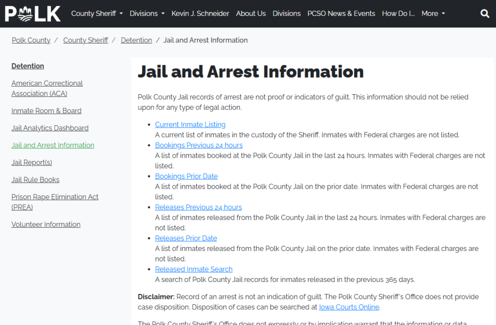 - Visit the https://www.polkcountyiowa.gov/county-sheriff/detention/jail-and-arrest-information/ or use the jail’s online portal.