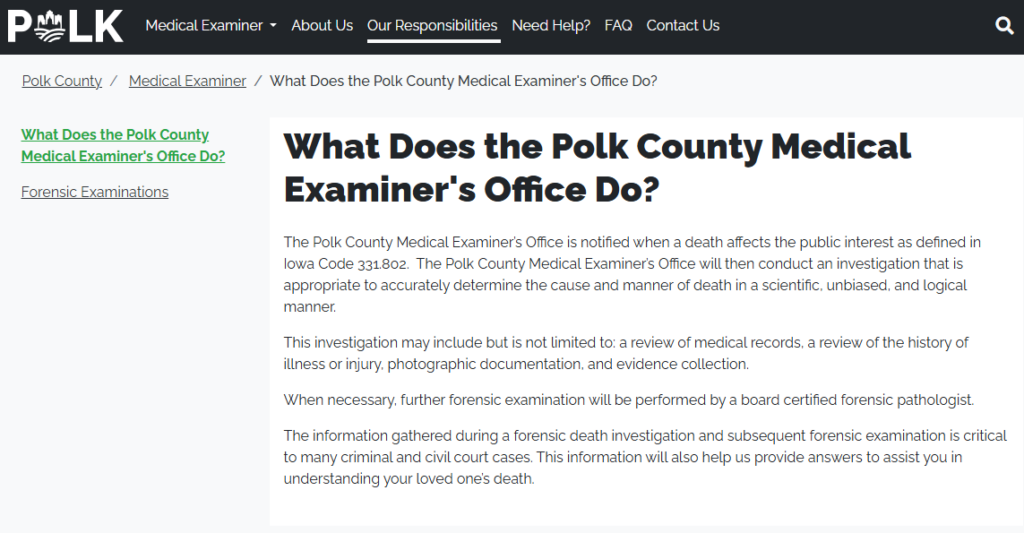 Under Iowa Code 331.802, the Polk County Medical Examiner conducts medicolegal death investigations when a death is sudden, unexpected, or unattended. This law defines situations that trigger investigation, including: