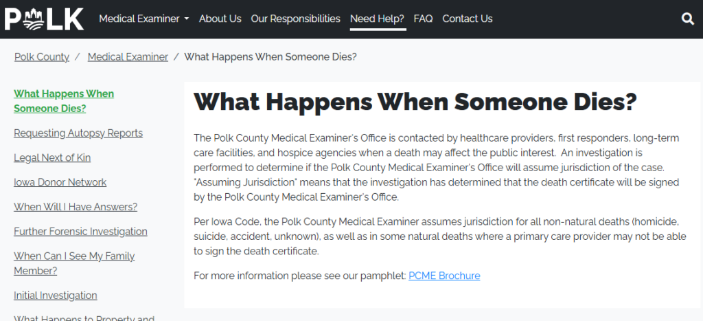 - https://www.polkcountyiowa.gov/medical-examiner/what-happens-when-someone-dies/