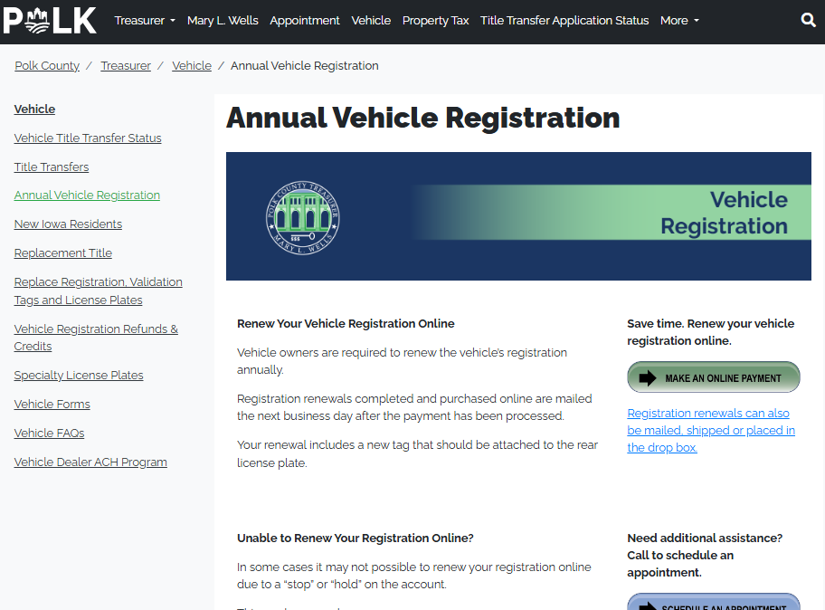 - In-person renewal: Visit the Polk County Treasurer in Des Moines to submit documents, pay fees, and receive immediate registration.
