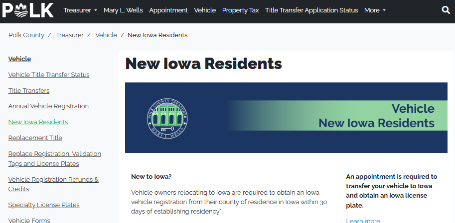 Residents moving to Polk County must register any out-of-state vehicle https://www.polkcountyiowa.gov/treasurer/vehicle/new-iowa-residents/ within 30 days of establishing residency. The Polk County DMV handles vehicle registration, title transfers, and license plates for new arrivals.