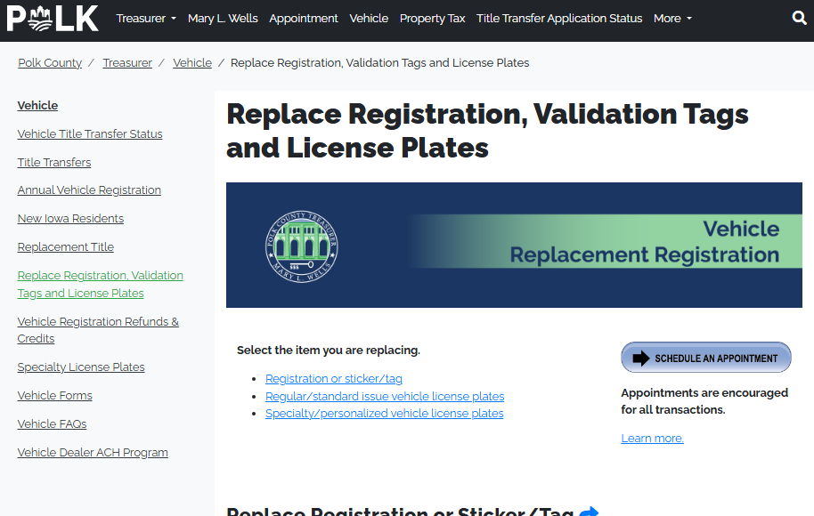 Replacing a vehicle registration, sticker, or license plate in Polk County https://www.polkcountyiowa.gov/treasurer/vehicle/replace-registration-validation-tags-and-license-plates/ is straightforward. Residents can quickly get a replacement by visiting the local DOT office or submitting the proper forms with the required fee.