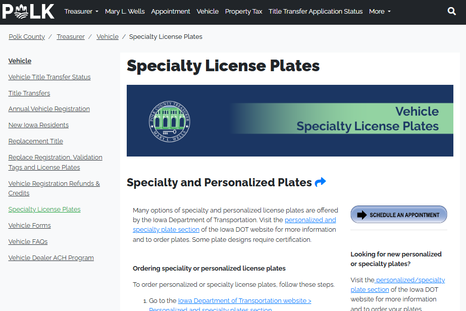 Polk County residents can choose from a variety of specialty plates in Iowa and personalize their vehicle plates for an additional fee. These plates allow vehicle owners to show support for causes, schools, or personal interests while following Iowa DOT rules.