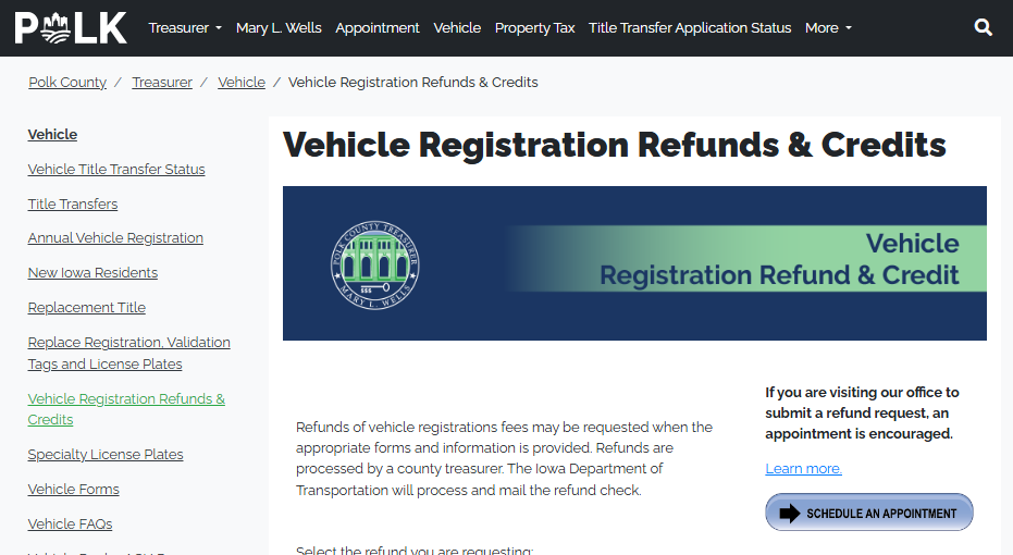 Polk County vehicle registration fees are calculated based https://www.polkcountyiowa.gov/treasurer/vehicle/vehicle-registration-refunds-credits/ on the type, age, and weight of a vehicle. Refunds may be available if a vehicle is sold, leased, or moved out of state before the registration period ends.
